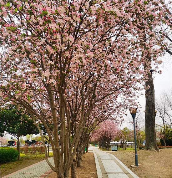 日前,周口公園里的海棠紛紛綻放。在公園內的道路上,海棠已進入盛花期,粉色的花朵如夢似幻,令人沉醉。