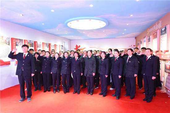 全體干警還在鮮紅的黨旗前,高舉右拳,重溫入黨誓詞。