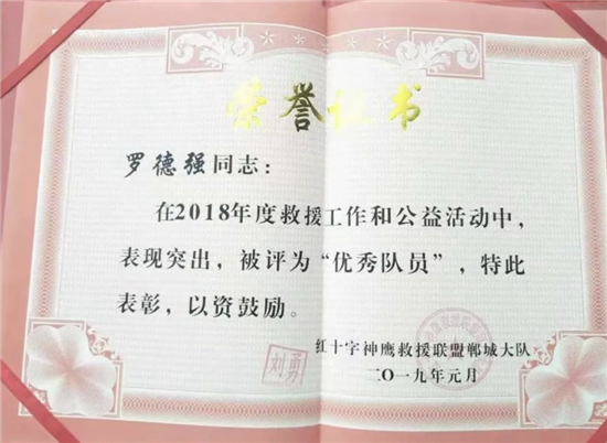 鄲城縣神鷹救援隊(duì)隊(duì)長(zhǎng)劉勇說(shuō),正是看到了羅德強(qiáng)的優(yōu)秀品質(zhì),2018年將羅德強(qiáng)吸納為神鷹救援隊(duì)員?!吧聱椌仍?lián)盟鄲城大隊(duì)隸屬于中國(guó)神鷹救援隊(duì),由各個(gè)行業(yè)的志愿者組成,也是河南省成立最早的一支民間救援隊(duì),除參加全國(guó)各地災(zāi)后救援活動(dòng)外,日常積極參加社會(huì)志愿者活動(dòng)?!薄拔乙粋€(gè)人的力量很有限,加入這個(gè)優(yōu)秀集體,能夠?qū)W到更多專業(yè)救援知識(shí),從而幫助更多的人,我感到非常驕傲和自豪?!绷_德強(qiáng)說(shuō)。2019年8月10日,受第九號(hào)臺(tái)風(fēng)“利奇馬”影響,山東省壽光市、東營(yíng)市等部分地區(qū)遭受洪災(zāi)。8月11日晚上,紅十字神鷹救援聯(lián)盟鄲城大隊(duì)趕赴山東壽光救災(zāi)。面對(duì)洪災(zāi),羅德強(qiáng)和其他救援隊(duì)員不畏辛苦,劃船深入各個(gè)受災(zāi)鄉(xiāng)村救助被困群眾。壽光市一鄉(xiāng)鎮(zhèn)3處大閘因斷電出現(xiàn)險(xiǎn)情,需要人力進(jìn)行開閘泄洪。羅德強(qiáng)和隊(duì)員冒險(xiǎn)攀爬到大閘上進(jìn)行人工作業(yè),經(jīng)過(guò)3個(gè)多小時(shí)的奮戰(zhàn),3處大閘全部打開,安全泄洪。2019年9月1日,參加泳渡日月潭返程途中,羅德強(qiáng)在福建高速公路上,發(fā)現(xiàn)前方車輛發(fā)生車禍,一名司機(jī)腿部骨折、血流不止。他立即下車和司機(jī)溝通,一邊報(bào)警,一邊利用專業(yè)救援知識(shí)打開變形的車門,順利將司機(jī)救出?!坝捎谶^(guò)度驚嚇,司機(jī)以骨折為由拒絕下車。當(dāng)我告訴司機(jī)自己是神鷹救援隊(duì)員、救援技術(shù)過(guò)硬后,才同意我們施救?!碑?dāng)時(shí)高速上車流密集,情況十分危險(xiǎn),如果司機(jī)不能及時(shí)救出,后果不堪設(shè)想?!拔覀冘囕v加油、住宿、吃飯等救援費(fèi)用都是隊(duì)員AA制負(fù)擔(dān),從來(lái)不給當(dāng)?shù)卣蚓戎颂砣魏温闊!?/p>