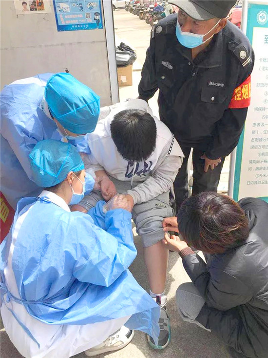 鄲城縣中心醫(yī)院預檢分診醫(yī)生譚松月,護士趙哲哲、徐曼曼見狀連忙上前,在保安的協(xié)助下,將孩子攙扶到醫(yī)院門口。