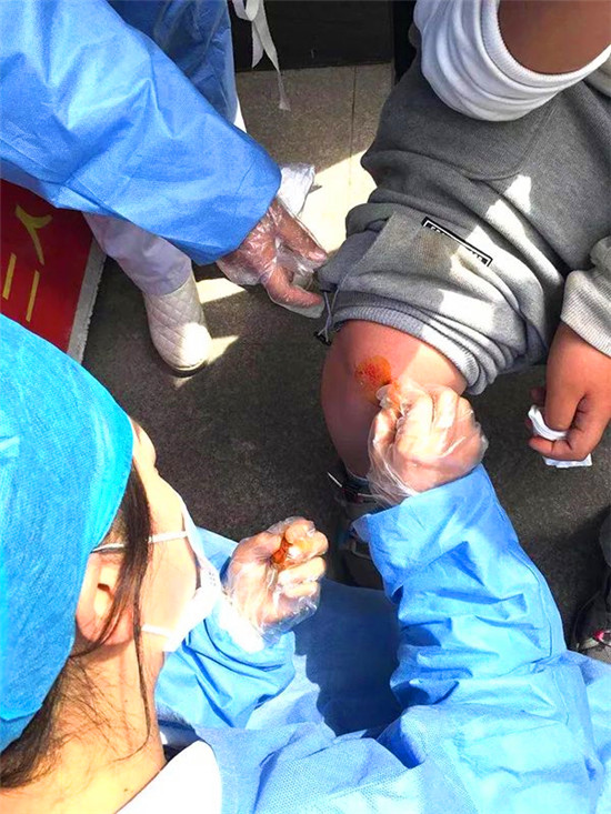 醫(yī)護人員檢查無大礙,拿來碘伏、棉球、紗布為其包扎消毒傷口。同時安慰孩子,電話聯(lián)系家長,直至將孩子交給家長。