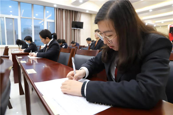 競賽現(xiàn)場,大家勤于思考、冷靜答卷,充分展現(xiàn)了法院干警的知識水平和教育整頓學習教育效果。