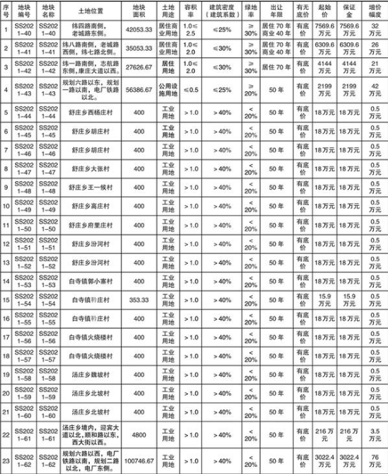 備注:(1) SS2021-40號土地商業(yè)建筑面積不大于地塊地上總建筑面積的10%,地上附屬物由國資局負(fù)責(zé)處理。(2)SS2021-41號土地商業(yè)建筑面積不大于地塊地上總建筑面積的10%。(3) SS2021-44號至SS2021-61號用于風(fēng)力發(fā)電項目,統(tǒng)一規(guī)劃建設(shè),競買人須同時報價競買。
