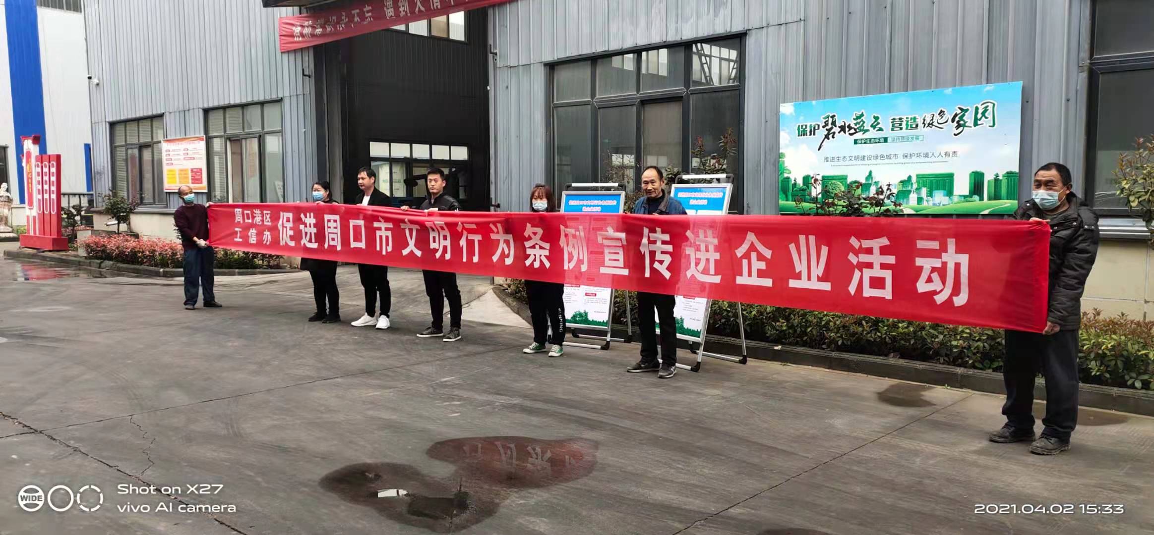 為迅速掀起學(xué)習(xí)宣傳《文明行為促進(jìn)條例》熱潮,不斷提升廣大企業(yè)員工文明法治意識(shí)、社會(huì)責(zé)任意識(shí),運(yùn)用法律法規(guī)規(guī)范促進(jìn)文明行為,4月2日下午,周口港區(qū)工信辦組織人員開展宣傳《周口市文明行為促進(jìn)條例》進(jìn)企業(yè)的活動(dòng)。