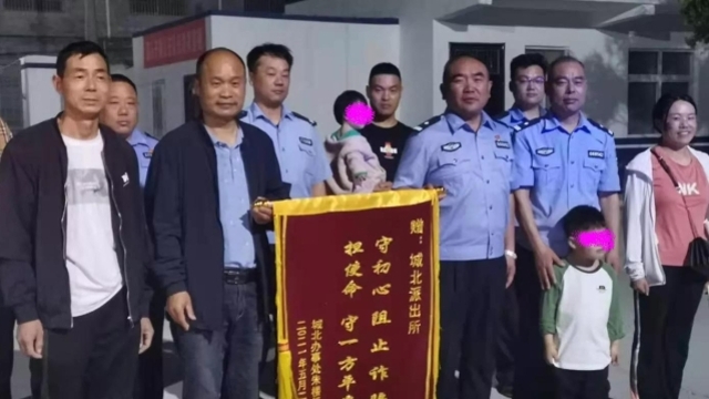5月26日,城北辦事處朱樓村6名村民一起前往城北派出所,送上一面繡有“守初心阻止詐騙 擔使命守一方平安”鮮紅錦旗。