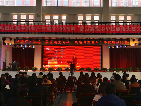 項(xiàng)城一中教師侯靜靜以一首《芳華獻(xiàn)百年 共筑中國夢》朗誦,激昂慷慨地道來黨的百年滄桑與豐功偉績,又深情地講述一個又一個黨員教師的風(fēng)采故事,讓人肅然起敬,見賢思齊;宏林學(xué)校教師霍詩羽的《沒有共產(chǎn)黨就沒有新中國》,以滿懷對黨的熱愛與感恩、忠誠,講述著黨的奮斗史和堅(jiān)守崗位奉獻(xiàn)教育的動人故事……給觀眾留下了深刻印象。