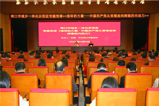 為貫徹落實(shí)習(xí)近平總書記黨史學(xué)習(xí)教育動(dòng)員大會(huì)重要講話精神,全面推進(jìn)全區(qū)黨史學(xué)習(xí)教育工作,4月9日上午,周口市城鄉(xiāng)一體化示范區(qū)組織專題黨課學(xué)習(xí),邀請(qǐng)中共周口市委黨校黨史黨建教研室主任,副教授紀(jì)穎講授《信仰的力量——中國(guó)共產(chǎn)黨從苦難走向輝煌的內(nèi)動(dòng)力》專題黨課,示范區(qū)副處級(jí)以上干部、區(qū)直全體黨員干部、鄉(xiāng)、辦、站、所負(fù)責(zé)人、全體村(社區(qū))支部書記參加會(huì)議。