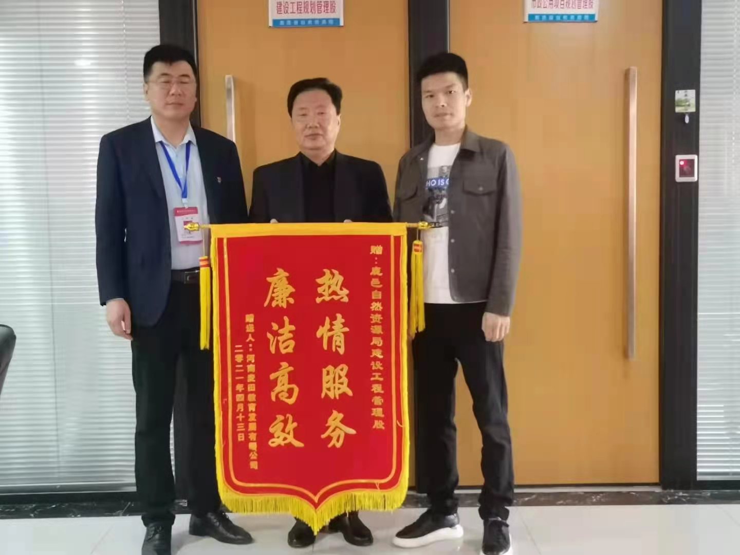 4月14日上午,河南麥田教育發(fā)展有限公司將一面印有“熱情服務(wù)、廉潔高效”字樣的錦旗送到了鹿邑縣自然資源局建設(shè)工程規(guī)劃管理股,感謝他們提供了優(yōu)質(zhì)高效服務(wù)。