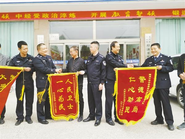 “幾天前,當警方通知我妹妹在河南周口找到時,我們?nèi)叶己芗?,真心感謝周口的警察同志,你們辛苦了!”胡某某的哥哥向經(jīng)濟開發(fā)區(qū)公安分局民警深深鞠躬致謝,并將一面寫有“警德高尚 仁心助民”的錦旗送到經(jīng)濟開發(fā)區(qū)公安分局副局長張國華、刑偵大隊負責人宋東營手中(如圖)。