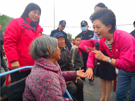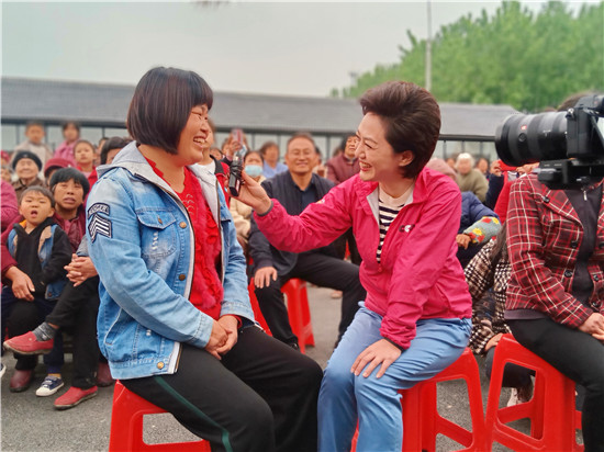 (圖片說(shuō)明:央視主持人海霞登臺(tái)向?qū)O莊村群眾問(wèn)好)