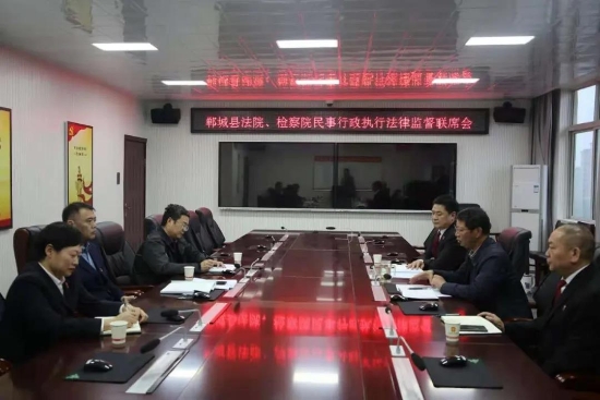 為進一步推動教育整頓工作,認真落實省院、市院關于開展民事行政執(zhí)行法律監(jiān)督專項活動的要求,推動民事、行政檢察工作順利開展,解決人民群眾反應強烈的執(zhí)行難、執(zhí)行亂等問題,4月20日下午,鄲城縣檢察院黨組書記、代檢察長陸智明和縣院黨組成員、副檢察長馬立強以及第四檢察部員額檢察官李平會同縣法院有關領導召開了民事行政執(zhí)行法律監(jiān)督聯(lián)席會。縣法院黨組書記、院長王洪彬應邀出席會議。