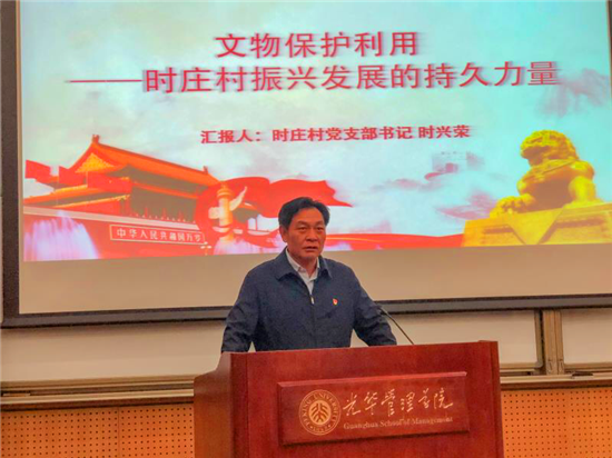 時興榮以“文物保護(hù)利用——時莊村振興發(fā)展的持久力量”為題發(fā)言。從四個方面闡述了時莊村在糧倉遺址的文物發(fā)掘、保護(hù)、利用中的故事。時興榮說,鄉(xiāng)村干部要有“大象肚子、兔子腿,還要長個八哥嘴”,即能容人容事,為村民辦事要手勤、腳勤,調(diào)解矛盾、宣傳政策要以文化人,想群眾之所想。黨員心里有初心,黨的形象不受損,支部心里有群眾,群眾永遠(yuǎn)跟黨走。在他的帶領(lǐng)下,時莊村致力于發(fā)揮好、保護(hù)好、利用好考古文物發(fā)掘的機遇,轉(zhuǎn)變思想觀念,將文物發(fā)掘、文物保護(hù)、文物利用作為時莊村各項事業(yè)開展的重心,為時莊村未來的發(fā)展厘清思路、定準(zhǔn)方向。他的演講引來在場北京大學(xué)學(xué)生的陣陣掌聲。