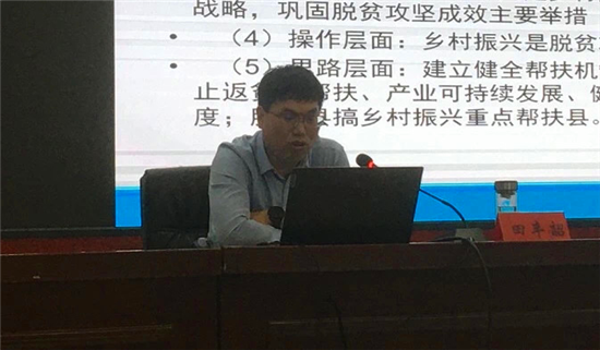 培訓(xùn)班由河南大學(xué)田豐韶教授主講,田豐韶是河南大學(xué)哲學(xué)與公共管理學(xué)院副院長,長期從事減貧與發(fā)展、三農(nóng)工作領(lǐng)域等教學(xué)與研究工作。主持國家社科基金項目1項,教育部、民政部、國家扶貧辦等省部級項目7項,參與項目38項。出版專著1部,合著3本。承擔(dān)國務(wù)院扶貧辦委托課題習(xí)近平扶貧論述實踐案例研究、貧困縣摘帽案例研究(循化)、十八洞村精準(zhǔn)扶貧典型案例研究、“決勝全面小康:蘭考故事”等課題6項,參與國務(wù)院扶貧辦及各地扶貧辦委托課題:“西藏脫貧攻堅經(jīng)驗總結(jié)”“蘭考精準(zhǔn)扶貧經(jīng)驗總結(jié)”“西北區(qū)域縣、村脫貧攻堅經(jīng)驗總結(jié)6項,研究報告及重大政策建議得到國家扶貧辦充分肯定。