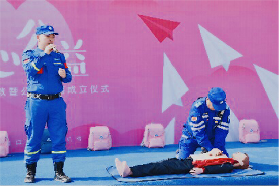 活動現(xiàn)場,藍(lán)天救援隊隊長孟坤以多年救援經(jīng)驗,與隊員們互相配合,演示如何正確穿戴救生衣、如何正確實施心肺復(fù)蘇術(shù)等,還生動演繹了當(dāng)學(xué)生遇到有人落水等突發(fā)情況,如何在保證自己不受傷害的情況下實施救援。