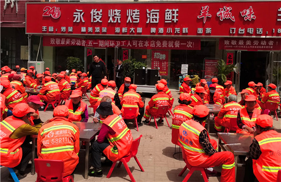 4月29日中午,200多名環(huán)衛(wèi)工人在商水縣城丘生路一飯店內(nèi)聚餐。為表達(dá)對環(huán)衛(wèi)工人的敬意,讓他們過一個愉快的五一節(jié),該飯店從4月29日至5月1日分三批邀請全縣600多名環(huán)衛(wèi)工在此免費享用午餐。②7