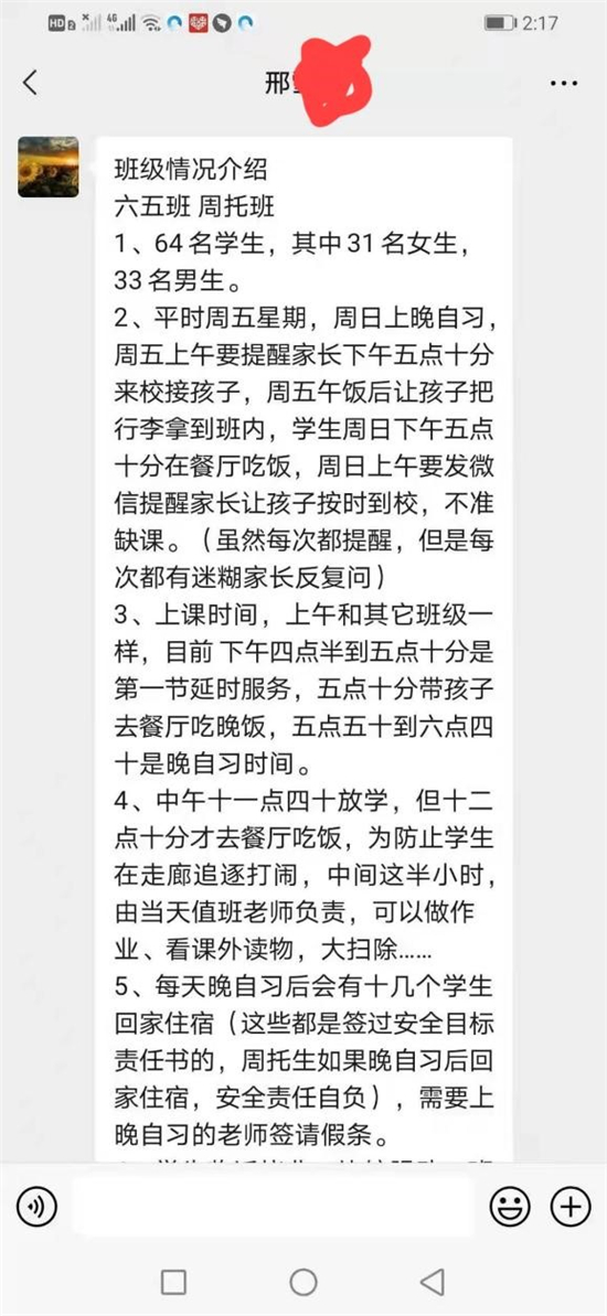 2、平時(shí)周五星期,周日上晚自習(xí),周五上午要提醒家長(zhǎng)下午五點(diǎn)十分來(lái)校接孩子,周五午飯后讓孩子把行李拿到班內(nèi),學(xué)生周日下午五點(diǎn)十分在餐廳吃飯,周日上午要發(fā)微信提醒家長(zhǎng)讓孩子按時(shí)到校,不準(zhǔn)缺課。(雖然每次都提醒,但是每次都有迷糊家長(zhǎng)反復(fù)問(wèn))