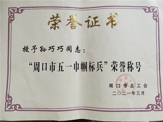 近日,周口市總工會隆重表彰全市各行各業(yè)涌現(xiàn)出的先進單位和先進工作者。鄲城縣中心醫(yī)院孫巧巧獲得“周口市五一巾幗標兵”榮譽稱號。