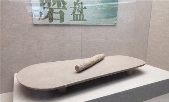 步入輝煌大氣的周口市博物館,走進(jìn)第一個(gè)展廳“宛丘之上”,右手邊第一個(gè)獨(dú)立展窗中陳列的,便是迄今為止我國(guó)發(fā)現(xiàn)時(shí)代最早、形制最大的裴李崗文化石磨盤,堪稱“華夏第一石磨盤”。第一眼看去,它并不驚艷,甚至有些平平無(wú)奇,有點(diǎn)像現(xiàn)在孩子們玩的“滑板”,也有點(diǎn)像切菜用的案板。實(shí)際上,它是周口這片土地上的先民賴以生存、難離難棄的生活工具,常與石磨棒配套使用,用于谷物的脫殼與加工。