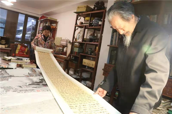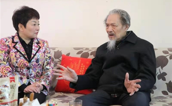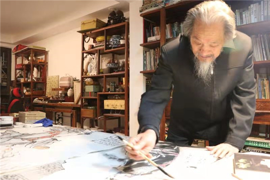 王殿舉先生是從老子故里鹿邑縣玄武鎮(zhèn)走出來的藝術(shù)家,他在七十余年的藝術(shù)生涯中,苦思求索攀登,寓教于藝,創(chuàng)作了大量寶貴的精品力作,生動地彰顯了文化藝術(shù)與時代同行、與社會共進的意義。他“手不停毫”用自己的畫筆繪老子、書陳摶,作品折射著中國時代與社會變化的烙印,貼近生活、貼近民風(fēng),真實而浪漫,歷久而彌新。陽春三月,風(fēng)清日朗。記者一行三人慕名前往鄭州拜訪王殿舉先生。他曾主編新中國成立之后第一部《鹿邑縣志》(120萬字)。退休后一直從事老子文化的研究,出版《老子》傳記(50萬字)。繪畫《老子畫傳》120米國畫長卷,被世界同道會在釣魚臺國賓館首展后,在世界各國巡展,而后相繼出版了《畫說老子》叢書八部。他的山水畫作曾被央視七臺、國務(wù)院扶貧辦、國家博物館和河南省委辦公廳収藏懸掛。聽說他有新作《陳摶傳》即將出版,我們好奇地走進了他的工作室,看到了五十余幅有關(guān)《陳摶傳》的國畫創(chuàng)作。他在繼承傳統(tǒng)以線造型的基礎(chǔ)上,容納了光影敷彩和成角透視,提高并增強了畫面的立體感和透視度,使畫作鮮活感人。拜讀他的作品,見畫如讀其文,心神為之一振。