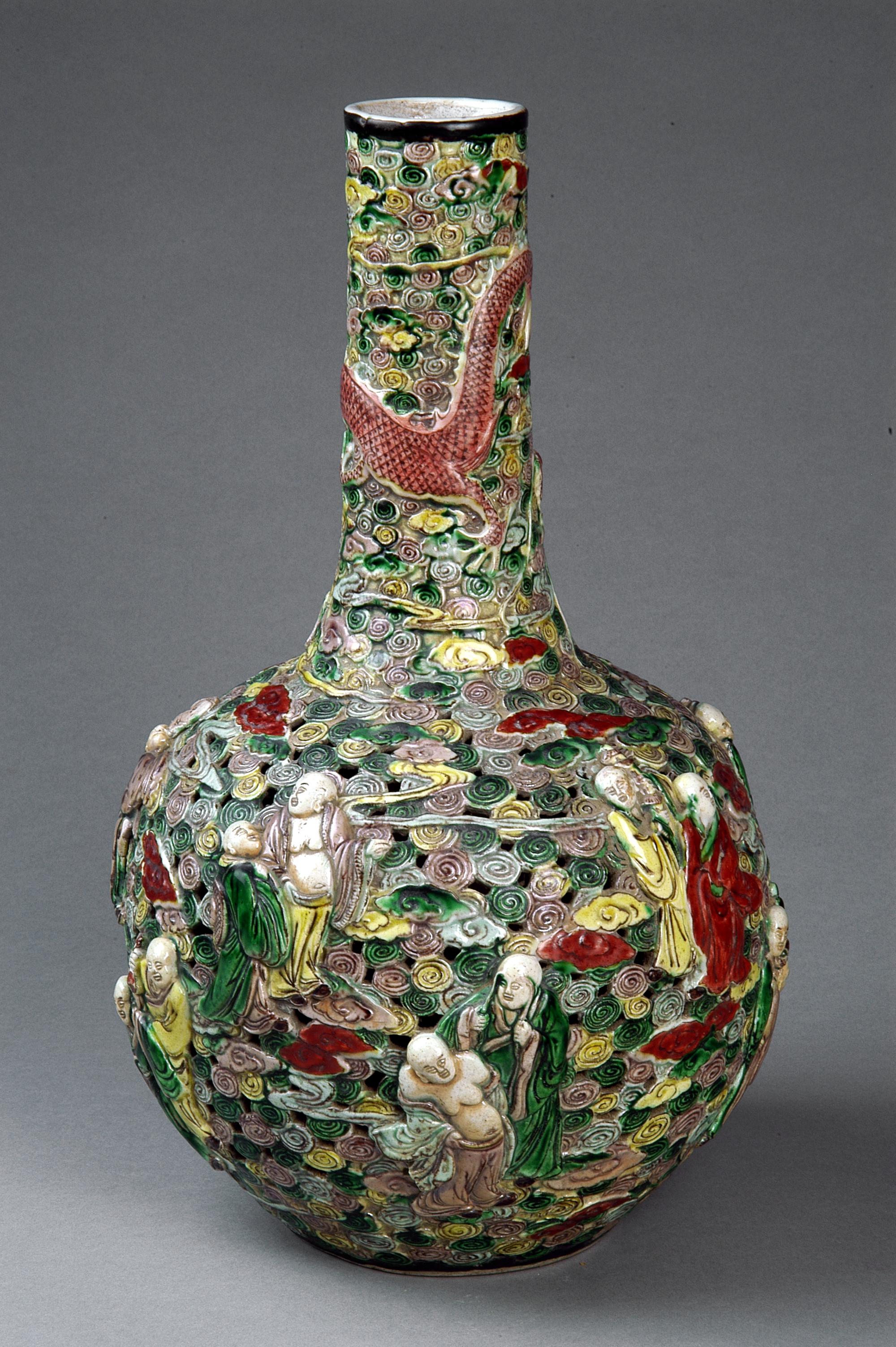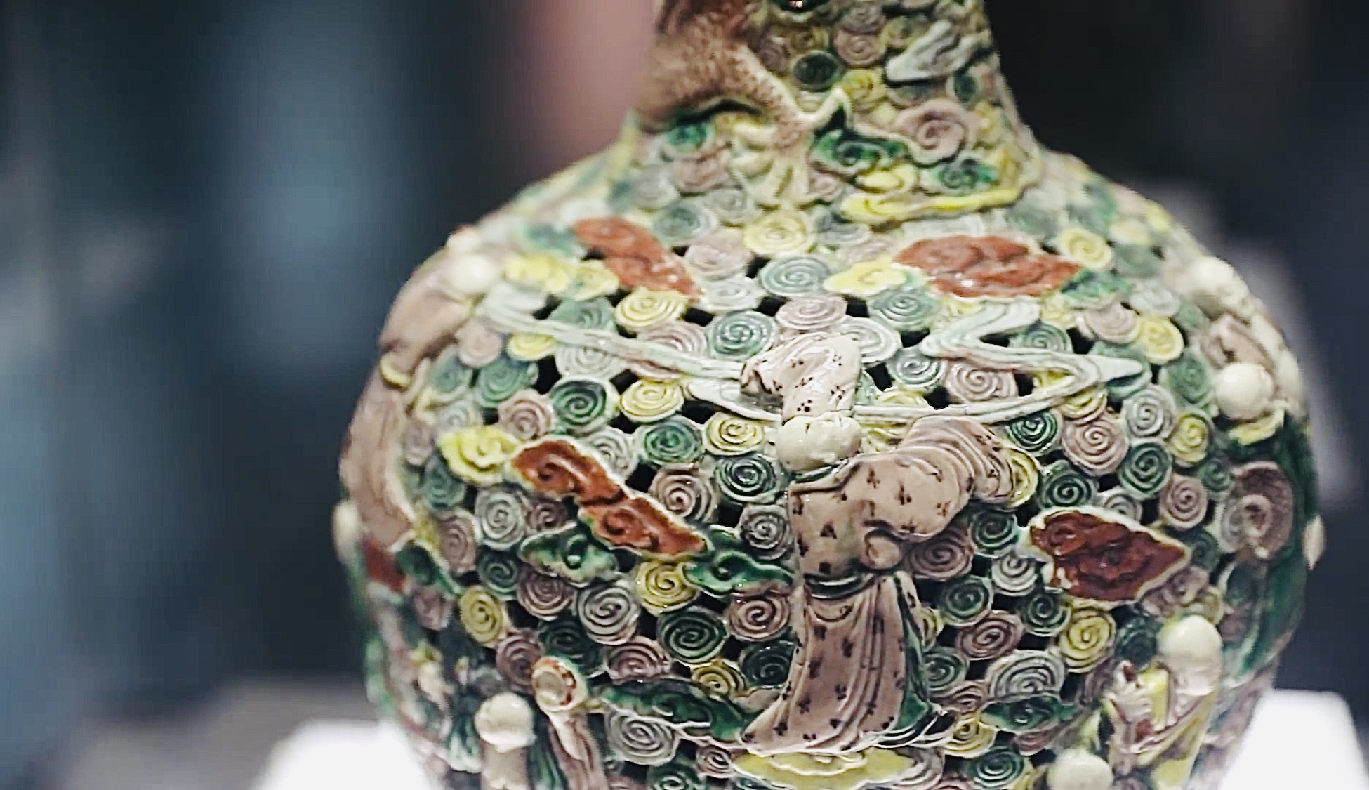 我是五彩透雕十八羅漢云龍瓶,又名古瓷流韻天球瓶。靜謐的空間里,我站在周口市博物館的玻璃展柜里,瞅瞅四周的兄弟姐妹,我偷偷笑了。雖沒(méi)有長(zhǎng)睫毛和雙眼皮,但我可是個(gè)十足的“混血兒”。技藝精湛、圖案華貴、色彩艷麗,我的稀有性和珍貴性常常讓來(lái)訪者驚嘆不已。和青花瓷相比,我更加瑰麗多彩,人稱文物界的“米蘭·可兒”。