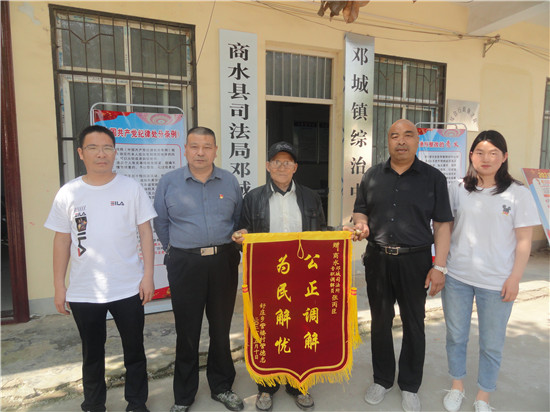 5月10日10時,商水縣司法局平店司法所院內嗩吶聲聲,一名中年男子將一面題有“品德高尚 熱心助人”字樣的錦旗送到司法所長劉靜靜和專職調解員王國勝的手中,并再三表示感謝。這名送錦旗的中年男子名叫雷得令,淮陽區(qū)朱集鄉(xiāng)大雷樓村人。雷得令為什么給平店司法所送錦旗呢?事情的起因是這樣的: