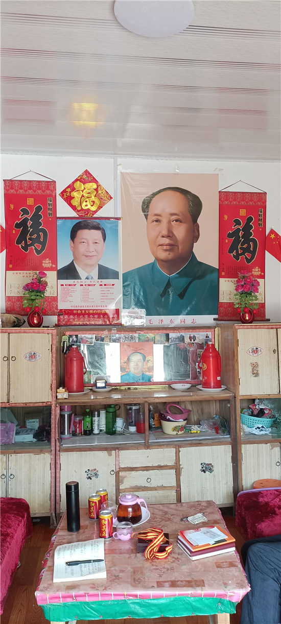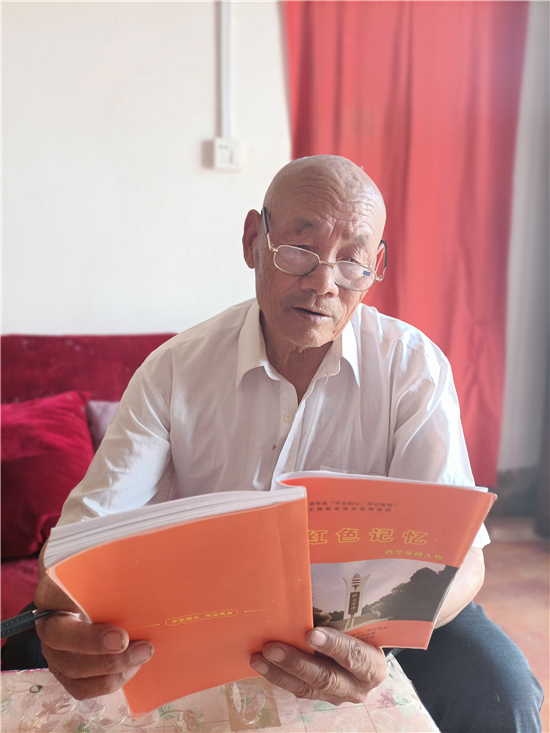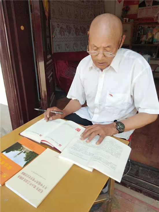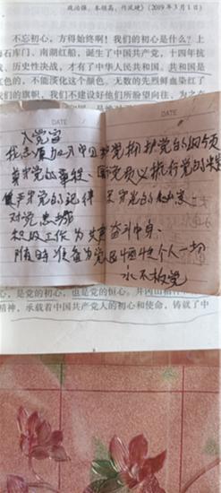 “老王,記者來采訪你了?!边M(jìn)得庭院,一同前往的西王營行政村婦聯(lián)主任王玉真高聲叫道。聽到有人前來,正在屋內(nèi)看書的王加科放下書本走了出來,熱情地把我們往屋里讓,他胸前佩戴的毛主席像張和黨徽在陽光的照耀下閃閃發(fā)光,“從我嫁到這里,覺得老王胸前的毛主席像章就沒有摘掉過?!蓖跤裾嬉贿呑咭贿呎f道。堂屋正中央的墻壁上端端正正的懸掛著毛澤東主席和習(xí)近平總書記畫像,畫像下方一張方桌、一對沙發(fā)和一個(gè)條幾就是全部家具。小方桌上放著《習(xí)近平關(guān)于“不忘初心 牢記使命”論述摘編》和《紅色記憶》兩本書籍和一大一小兩個(gè)筆記本。老人拿起那個(gè)已經(jīng)發(fā)黃破舊的小筆記本說,那個(gè)小本子已經(jīng)陪他好多年了,小筆記本的扉頁上是王加科老人多年前抄寫的“入黨誓詞”,最后的紙張上寫著“不忘初心,永遠(yuǎn)緊跟共產(chǎn)黨,黨指揮到哪里,我就跟到哪里”,翻開《習(xí)近平關(guān)于“不忘初心 牢記使命”論述摘編》,里面許多文字下面劃了橫杠,“我的文化程度不高,還是在部隊(duì)學(xué)會(huì)了一些字,許多字不會(huì)寫,就在重要的內(nèi)容下面用符號標(biāo)記,筆記上的好多字和符號你們認(rèn)不出來,但是我自己知道?!笨从浾吣闷饡矗跫铱评先怂坪跤行┎缓靡馑嫉恼f到,“不論到啥時(shí)候,入黨誓詞不能忘,要時(shí)刻記在心里,要始終以百姓的心為心?!?/p>