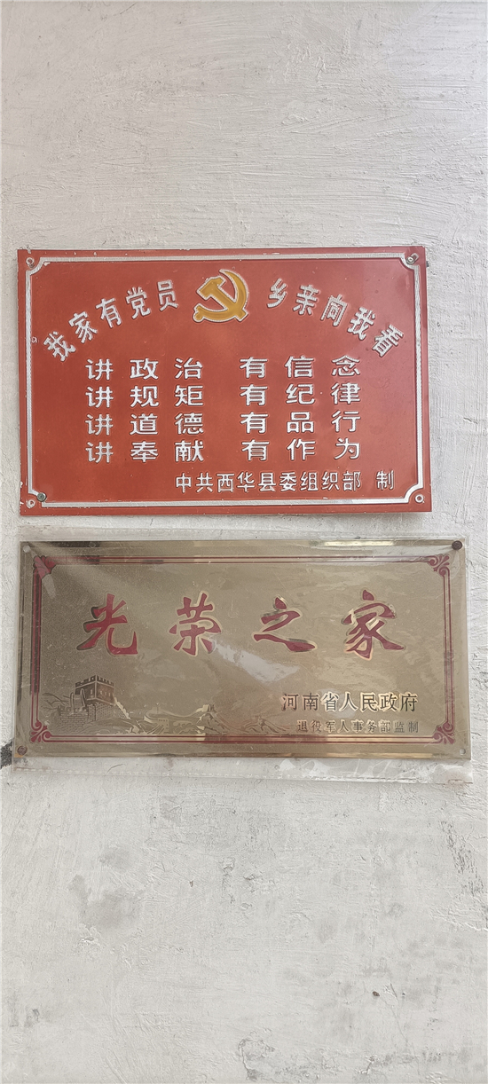 王加科的家位于西王營行政村的東北角,三間上世紀(jì)90年代蓋的瓦房與鄰居蓋起的樓房相比顯得有些低矮。大門上的固定著兩個(gè)金屬牌子,一個(gè)是一個(gè)是河南省人民政府為軍屬頒發(fā)的“光榮之家”均屬牌,一個(gè)是中共西華縣委組織部制作的上書有“我家有黨員 鄉(xiāng)親向我看”的“四講四有”牌子。進(jìn)得大門,只見不大的院子整理的井井有條,一條青磚鋪成的小道直通向堂屋,小道兩邊栽種著各種蔬菜。