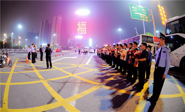 5月14日22時(shí),商水縣在寧洛高速周口南站口舉行隆重的歡迎儀式,迎接外出執(zhí)行抓捕任務(wù)凱旋的民警輔警??h委副書記張峰,縣人大常委會(huì)副主任楊新權(quán),縣政協(xié)副主席劉萬(wàn)華,縣政府黨組成員、公安局長(zhǎng)王之棟等出席儀式。縣公安局黨委班子成員、局直警種負(fù)責(zé)人和民警代表參加了活動(dòng)。