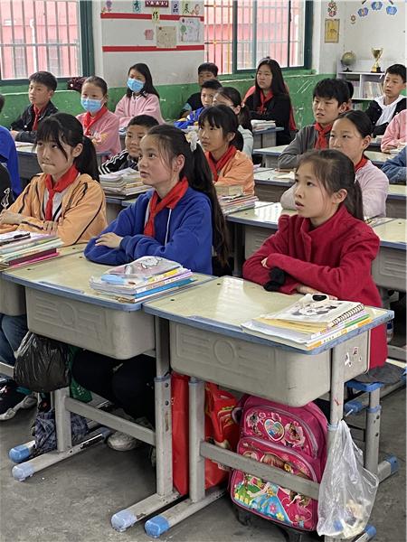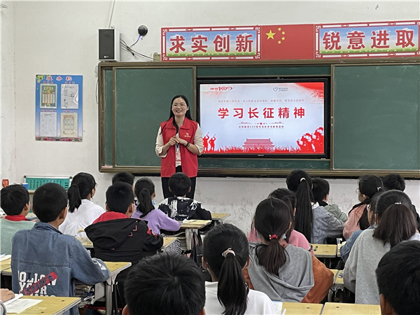 教室里,同學(xué)們聚精會神地聽著老師講革命先輩長征的故事,從巧渡金沙江到飛奪瀘定橋,圖文并茂,讓學(xué)生們從小知黨史、感黨恩,一顆紅心跟黨走,傳承紅色基因。