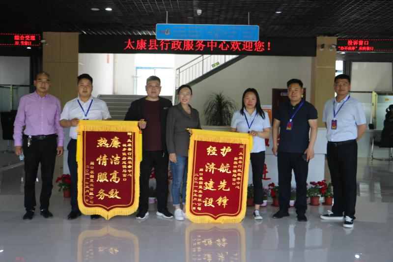 優(yōu)質(zhì)服務(wù)促發(fā)展,企業(yè)感動送錦旗。5月8日下午,周口展圖置業(yè)有限公司負(fù)責(zé)人帶著印有“護(hù)航先鋒、經(jīng)濟(jì)建設(shè)”和“廉潔高效、熱情服務(wù)”的錦旗,來到太康縣行政服務(wù)中心工程建設(shè)項(xiàng)目綜合受理窗口,對窗口工作人員專業(yè)貼心、熱情周到、規(guī)范高效的服務(wù)表達(dá)真摯感謝。