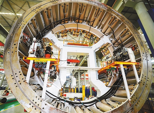 鄭州市經(jīng)開(kāi)區(qū)中鐵工程裝備集團(tuán)有限公司生產(chǎn)車(chē)間,工人在加緊生產(chǎn)。2009年在鄭州成立的中鐵裝備,目前已是中國(guó)最大的隧道掘進(jìn)機(jī)制造服務(wù)商。 聶冬晗攝(中經(jīng)視覺(jué))