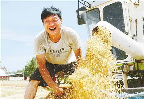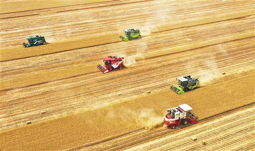 開(kāi)封市尉氏縣邢莊鄉(xiāng)府李莊村,農(nóng)機(jī)服務(wù)隊(duì)幫助村民收獲小麥。 李新義攝(中經(jīng)視覺(jué))