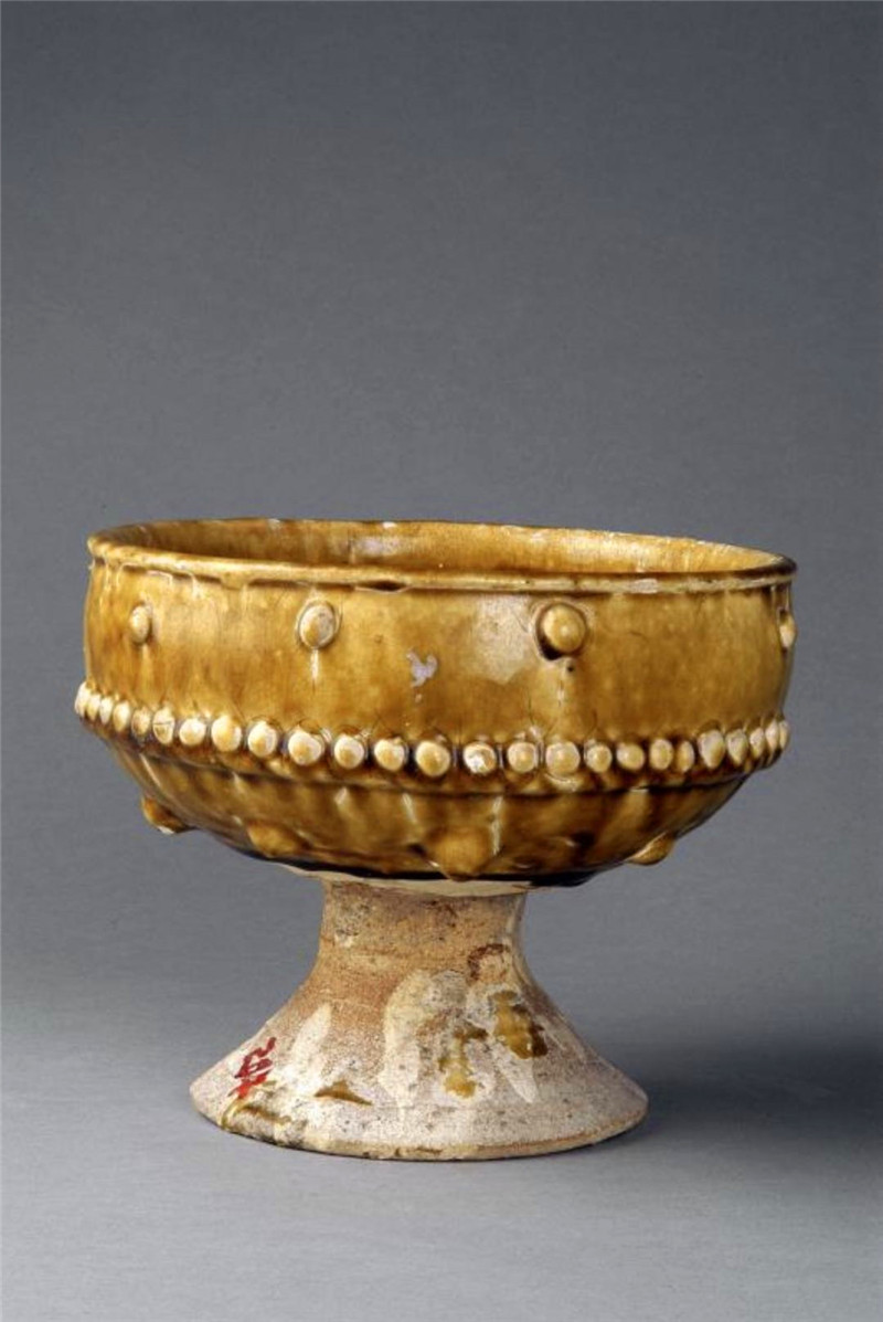 壽州窯主要生產(chǎn)與生活相關(guān)的碗、盞、杯、缽、注子等,其生產(chǎn)的高檔產(chǎn)品深受當時富貴之家追捧。唐代是中國歷史上的盛世,社會經(jīng)濟繁榮,黃釉瓷與體現(xiàn)皇權(quán)的皇家貴族崇尚的富貴色彩不謀而合,所以黃釉瓷器很快受到社會的熱捧,黃釉瓷豆也流行開來,且造型富于變化,這件黃釉乳釘紋豆口、腹、底部都有不同的變化,給人以線條流暢、造型優(yōu)美的印象。