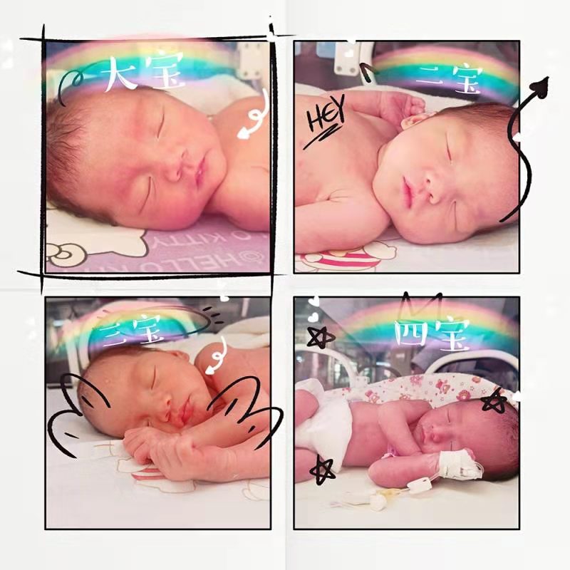 7月25日1時(shí)02分、03分、03分、04分隨著一陣陣啼哭聲,產(chǎn)婦經(jīng)剖宮產(chǎn)“三鳳一龍”四胞胎相繼出生,體重分別為2180g、2120g、2030g、1520g,全身紅潤,哭聲響亮,被安全送入危重新生兒救治中心監(jiān)護(hù)室進(jìn)行重點(diǎn)監(jiān)護(hù)。