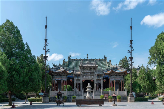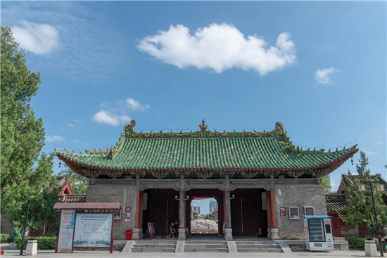 整個古建筑群為仿宮殿式,山門、鐵旗桿、石牌坊、碑亭、饗殿、大殿、河伯殿、炎帝殿、戲樓、拜殿、春秋閣由南向北,建于中軸線上,藥王殿、灶君殿和東廊房,財神殿、酒仙殿及西廊房在前院左右,東西看樓、東西配殿建在中院兩側,老君殿、馬王殿、瘟神殿為東偏房,客房僧舍位于西院。是全國重點文物保護單位,國家AAAA級旅游景區(qū),國家三級博物館。