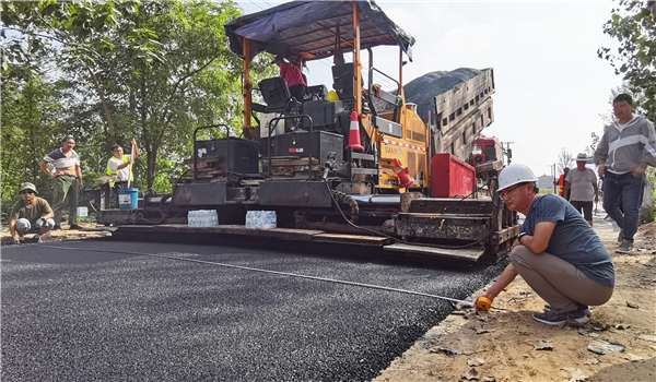 路面鋪油作業(yè)從淮陽區(qū)葛店鄉(xiāng)與鄲城縣李樓鄉(xiāng)交界處開始,一臺攤鋪機鋪設寬度為7米,壓實厚度為5厘米,以平均每分鐘5米的速度前行,數輛運料車輪流供料給攤鋪機。攤鋪機過后,兩臺壓路機交替運行,立即把路面壓實;兩臺灑水車配合作業(yè),路面一次成型,寬闊而平坦。