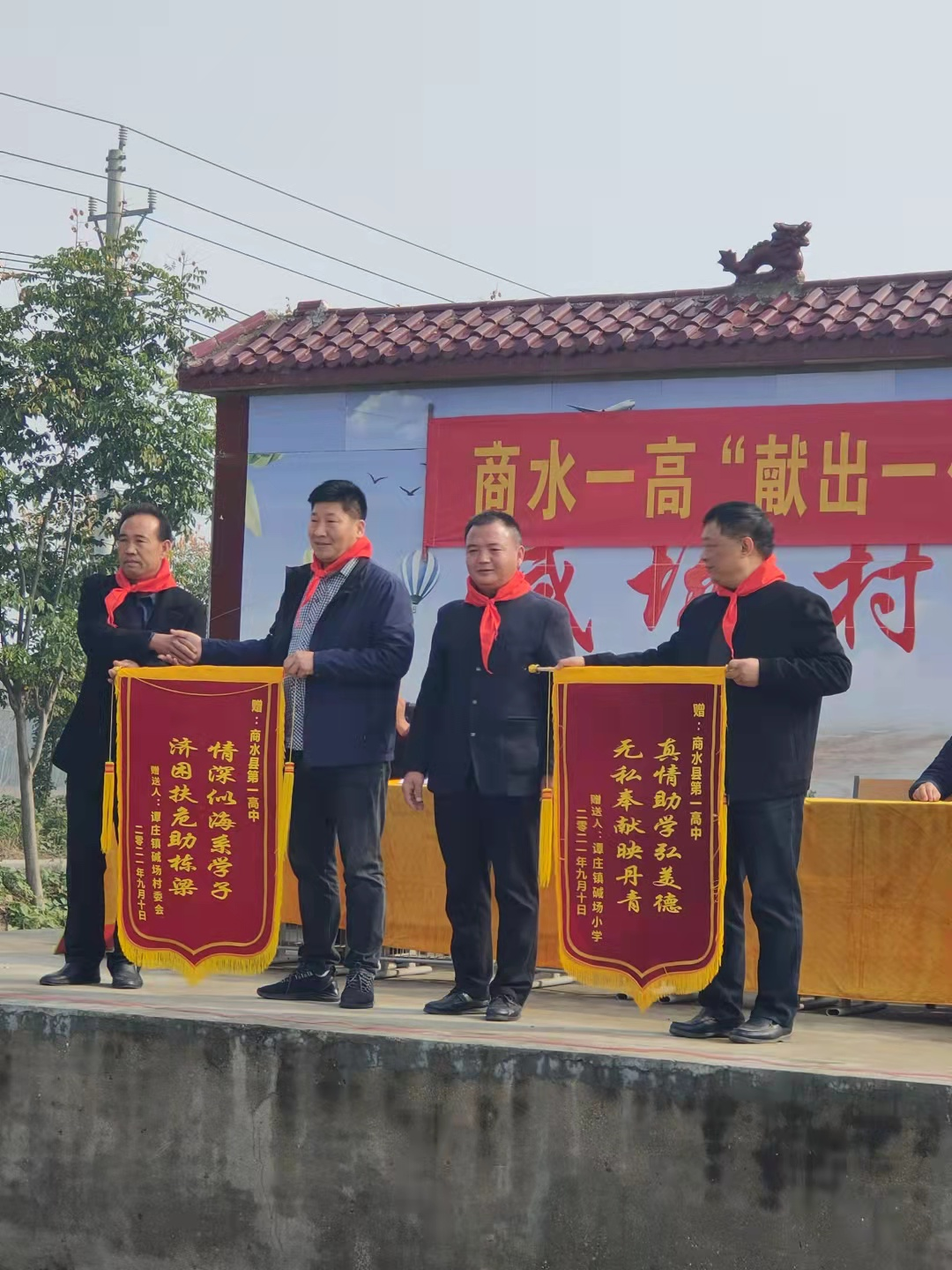 10月22日,商水一高向譚莊鎮(zhèn)堿場(chǎng)小學(xué)捐贈(zèng)了50套新桌凳,并受堿場(chǎng)村委會(huì)邀請(qǐng)?jiān)趬A場(chǎng)村文化廣場(chǎng)舉行了“獻(xiàn)出一份愛心,托起一片希望”捐贈(zèng)助學(xué)儀式。