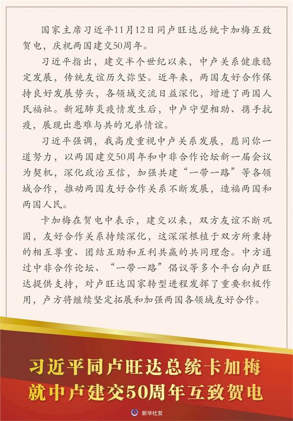 習(xí)近平同盧旺達總統(tǒng)卡加梅就中盧建交50周年互致賀電