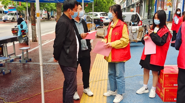 4月29日,商水團縣委組織30余名志愿者向沿街商戶宣傳疫情防控政策,提醒沿街商鋪商家落實好掃“兩碼”、測體溫、出入登記等各項疫情防控措施。