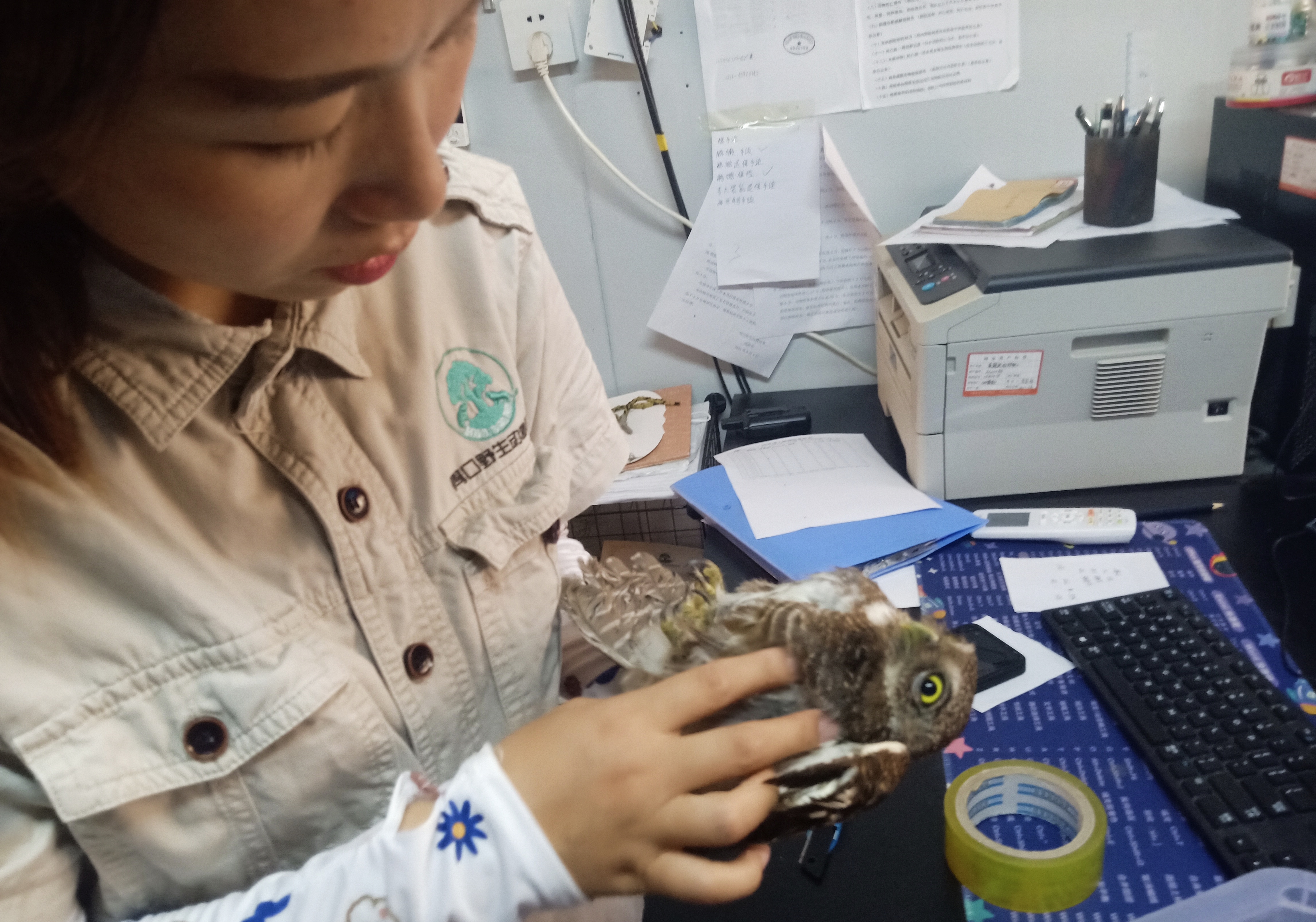 周口市野生動(dòng)物救護(hù)中心專(zhuān)業(yè)人員楊露露對(duì)這只斑頭鵂鹠進(jìn)行檢查傷情后說(shuō):“這只斑頭鵂鹠內(nèi)傷嚴(yán)重,需要治療一段時(shí)間才能放歸大自然?!?/p>