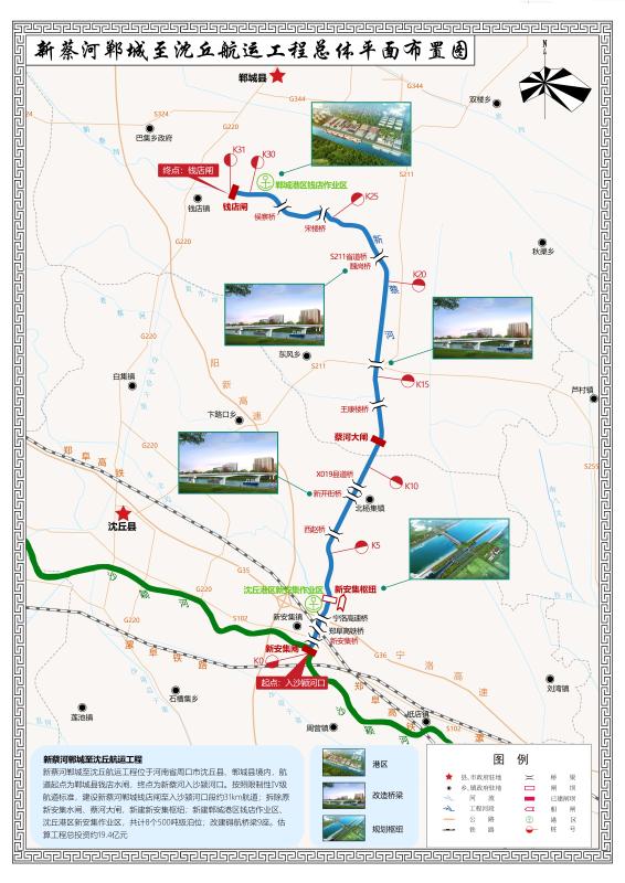 記者了解到,規(guī)劃中的鄲城港區(qū)是以新蔡河為依托,通過分析論證,確定其位置在新蔡河航運工程航道起點鄲城縣錢店鎮(zhèn),航道終點為沈丘縣新安集沙潁河口,航道里程31公里。航道通航標準為限制性Ⅳ級,設(shè)計船舶為500噸級。航道底寬40米,最小設(shè)計水深3.1米,最小彎曲半徑320米。船閘按照Ⅳ級船閘標準建設(shè)。沿線建設(shè)沈丘港區(qū)新安集、鄲城港區(qū)錢店兩個作業(yè)區(qū),設(shè)計500噸級泊位8個,改建礙航橋梁標準9座。初步估算,工程總投資19.4億元。