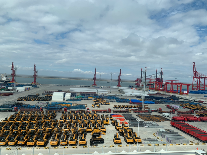 由于疫情防控的原因,記者沒能進入港口核心區(qū),只能站在港口辦公大樓樓頂遠眺港口。站在樓頂,港口景觀盡收眼底——挖掘機和風(fēng)機葉片被“碼”的整整齊齊,正待裝船出口;機器不停運轉(zhuǎn),給??康拇谎b卸貨物;重型貨柜車進出有序、川流不息。而令人驚奇的是,諾大的港口空無一人。