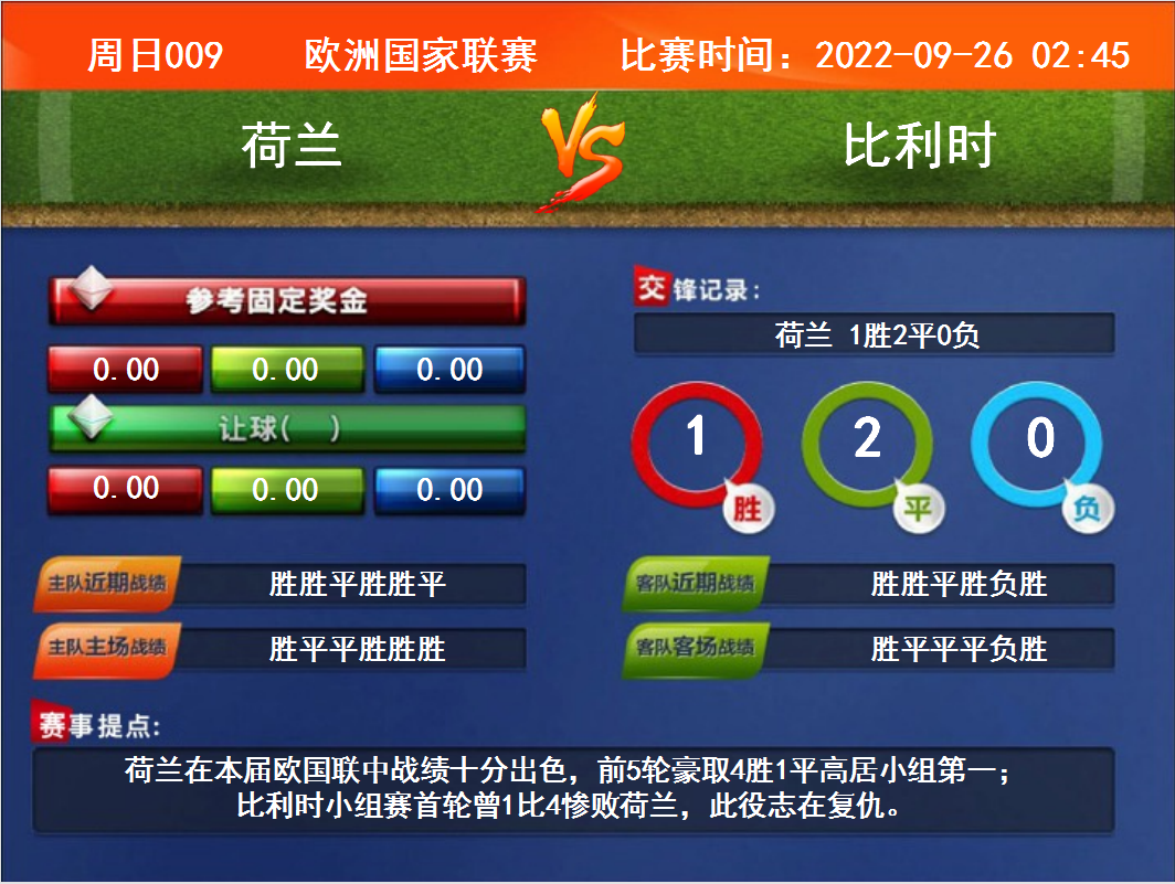 比賽時間:2022-09-26 02:45賽事提點(diǎn):荷蘭在本屆歐國聯(lián)中戰(zhàn)績十分出色,前5輪豪取4勝1平高居小組第一;比利時小組賽首輪曾1比4慘敗荷蘭,此役志在復(fù)仇。