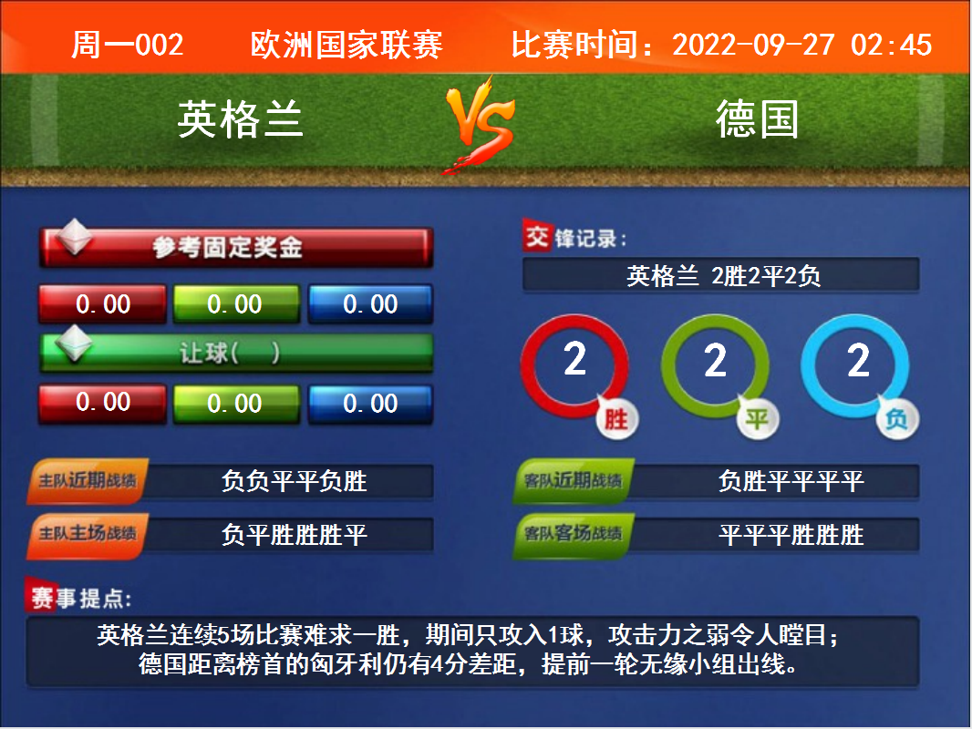 比賽時(shí)間:2022-09-27 02:45賽事提點(diǎn):英格蘭連續(xù)5場(chǎng)比賽難求一勝,期間只攻入1球,攻擊力之弱令人瞠目;德國(guó)距離榜首的匈牙利仍有4分差距,提前一輪無(wú)緣小組出線。