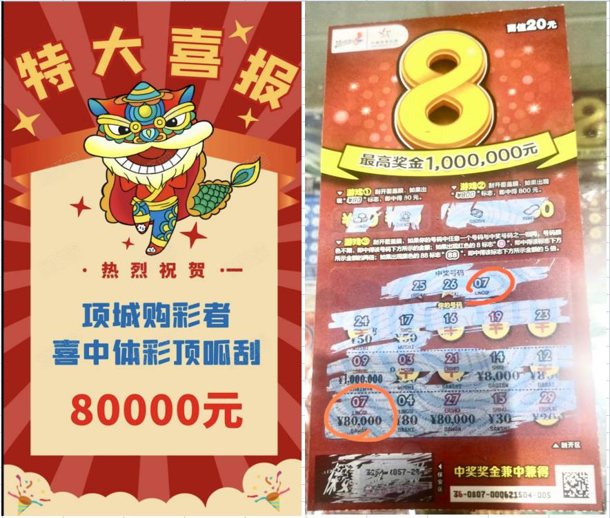 日前,張先生路過項(xiàng)城4116810161體彩實(shí)體店時(shí)挑選了幾張面值10元的“超值8”。沒想到其中一張竟刮出了8萬元大獎(jiǎng)。