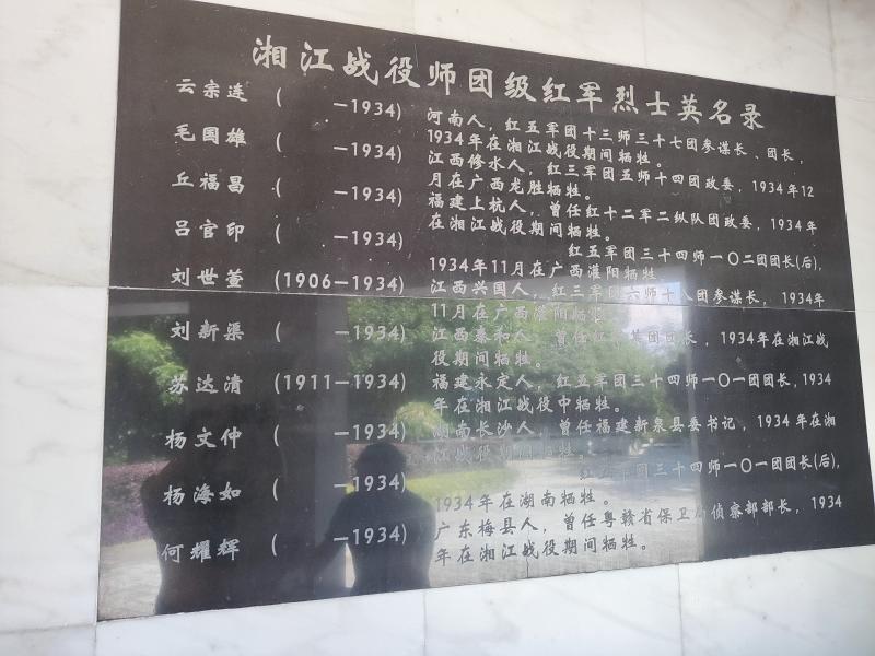 離開烈士英名長廊,記者攀登了184級臺階來到了山頂紀(jì)念碑碑亭。在高達(dá)34米的紀(jì)念碑亭內(nèi),記者意外發(fā)現(xiàn),里面收錄有湘江戰(zhàn)役期間師團(tuán)級紅軍烈士英名錄碑刻。