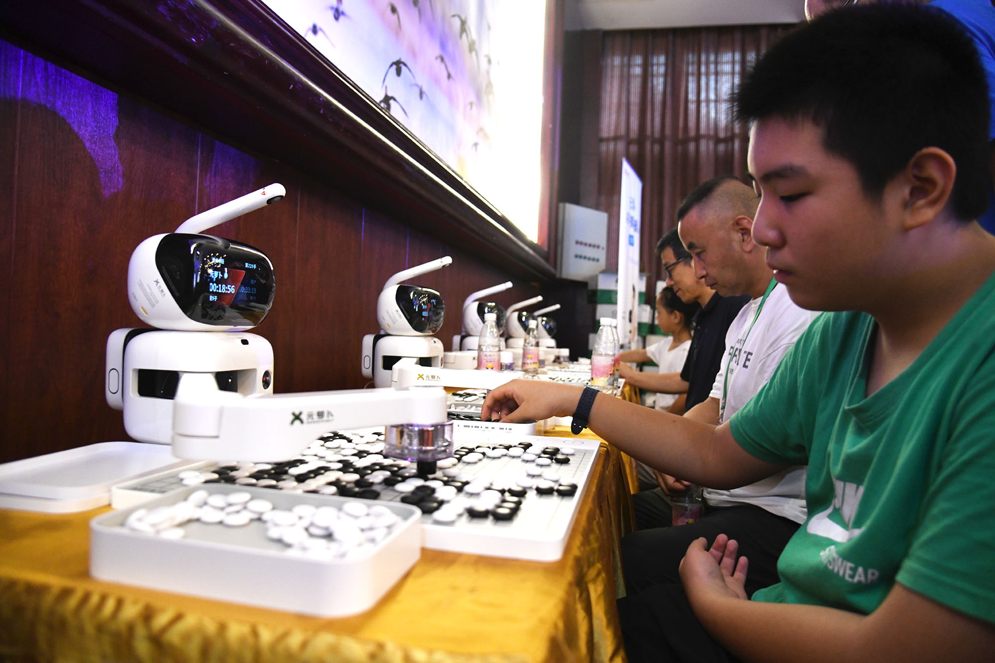 ?8月15日上午,圍棋棋手們?cè)谫愂麻g隙,和機(jī)器人對(duì)弈,增添不少樂趣。在2023中國淮陽第二屆“荷花杯”全國業(yè)余圍棋公開賽的賽場(chǎng)邊,賽事方特意擺放五部圍棋機(jī)器人,供棋手們?cè)谫愂轮鄪蕵?。工作人員介紹,這些圍棋機(jī)器人很強(qiáng)大,不上網(wǎng)聯(lián)機(jī)的情況下,它們具有業(yè)余圍棋三段水平,如果上網(wǎng)聯(lián)機(jī),則具有職業(yè)九段能力,人機(jī)大戰(zhàn),棋手們未必能贏了機(jī)器人。