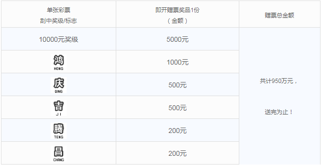 活動期間,購彩者在我省任一體彩銷售實體店購買指定活動票種,若單張彩票刮中符合獎勵條件的獎級或標志,經(jīng)實體店終端兌獎設備成功完成獎金兌付(如中獎)及促銷兌獎掃描后,即可獲得即開票贈票獎品一份??傤~有限,送完為止,詳見下表: