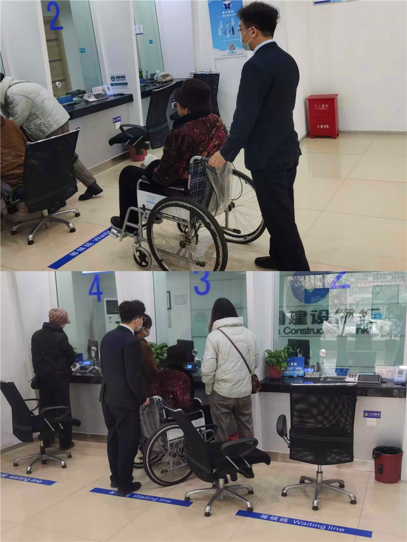 3月27日上午11點(diǎn)左右,項(xiàng)城蓮花大道支行大堂經(jīng)理張?jiān)评谠陂T口引導(dǎo)客戶時,發(fā)現(xiàn)兩位客戶扶著另一位客戶走進(jìn)網(wǎng)點(diǎn)。注意到客戶雙腿行走不便,他立即推來輪椅,把客戶扶到輪椅上。三位客戶不熟悉銀行辦業(yè)務(wù)流程,大堂經(jīng)理張?jiān)评谌谈S指導(dǎo)辦理業(yè)務(wù)。經(jīng)詢問,大堂經(jīng)理得知客戶前來辦理社??せ顦I(yè)務(wù),以便領(lǐng)取殘疾人補(bǔ)貼。大堂經(jīng)理立即幫他安排綠色通道,幫助家屬推輪椅到柜臺辦理,在一旁指導(dǎo)客戶填單跟簽名。