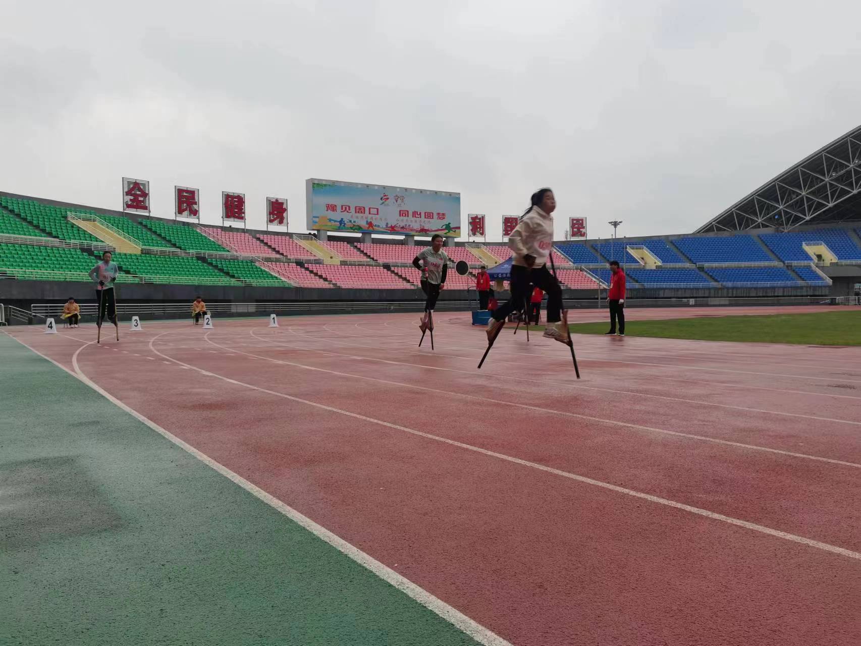 4月23日,河南省第九屆少數(shù)民族傳統(tǒng)體育運動會高腳競速項目預(yù)賽在周口體育中心田徑場開賽。隨著裁判一聲哨響,運動員們腳踩30多厘米的竹馬如離弦之箭向終點飛奔,他們在高腳馬上進行著速度和力量的比拼。